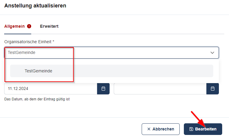 • Im Feld "Organisatorische Einheit" die gewünschte Zielorganisation auswählen