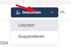 Bei Klick auf den kleinen Pfeil am rechten Rand des Buttons erscheint ein zusätzliches Menü, über welches der Benutzer gelöscht, oder suspendiert (deaktiviert) werden kann.
