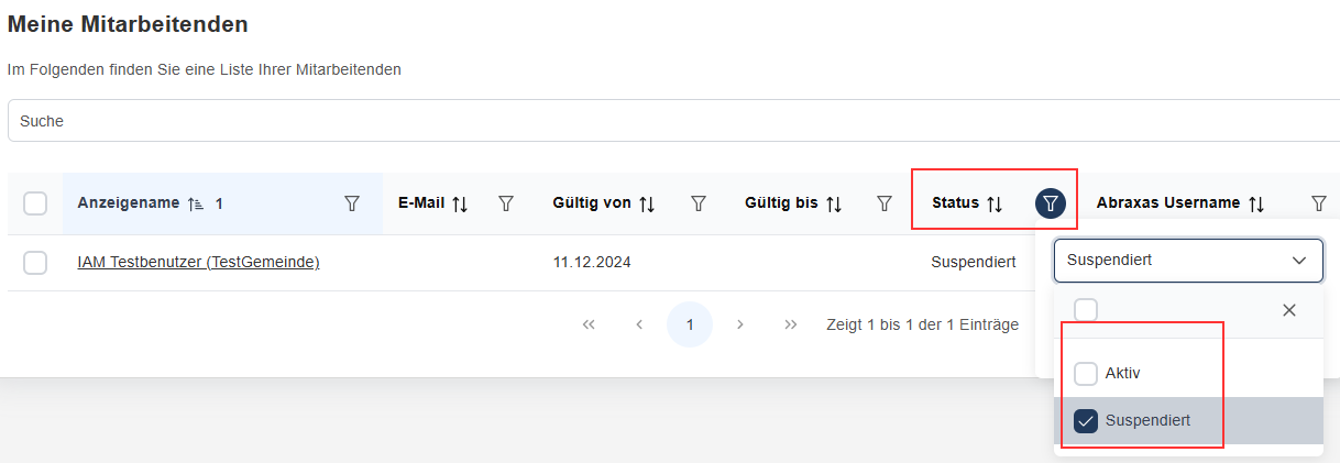 Standardmässig werden nur aktive Benutzer angezeigt. Über das Filter-Symbol können auch "suspendierte" eingeblendet werden.