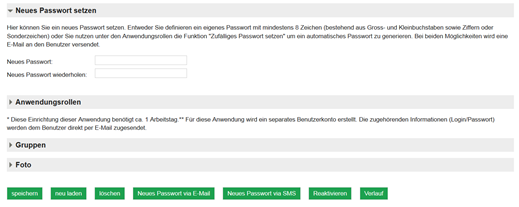 Um ein neues Passwort zu setzten, stehen zwei Möglichkeiten zur Verfügung. Zum einen kann selber ein neues Passwort gesetzt werden. Zum andern kann über den Button 'Neues Passwort via E-Mail' automatisch ein Passwort generiert werden. Dem Benutzer wird anschliessend ein Link per Mail gesendet, damit dieser im Self-Service-Portal ein eigenes Passwort setzen kann.