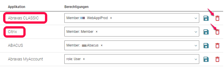 - Die Zeilen mit der Berechtigungszuweisung verschwinden. Der Zugriff auf Citrix wurde damit entfernt und der Benutzer hat kein Zugriff mehr auf die via Citrix bereitgestellten Anwendungen.