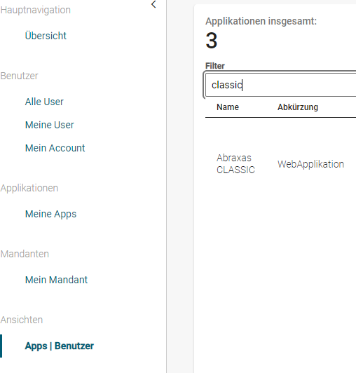 Es werden Ihnen die Applikationen Abraxas CLASSIC und Abraxas CLASSIC - grosse Schrift angezeigt. Klicken Sie einmal auf die gewünschte Applikation. Auf der rechten Seite erscheinen nun die Benutzer, welche diese Berechtigung zugewiesen haben.