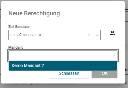 - Klicken Sie in das Suchfeld bei "Mandant" und drücken Sie die "Space" (Leerschlag)-Taste. Dann wird direkt der Mandant ausgewählt, mit dem Sie eingeloggt sind: