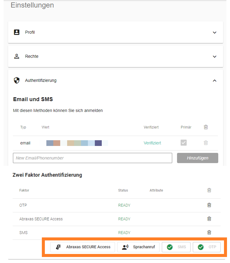 Die Methode und Verbindung, welche für die Authentifizierung via 2FA verwendet wird, kann bei Bedarf via MyAccount unter "Einstellungen/Authentifizierung/Zwei Faktor Authentifizierung" geändert werden.