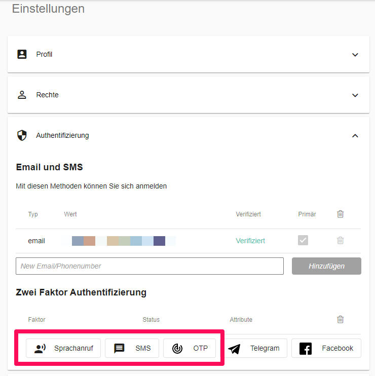 Die Telefonnummer, welche für die Code-Zustellung verwendet wird, kann bei Bedarf via MyAccount unter "Einstellungen/Authentifizierung/Zwei Faktor Authentifizierung" geändert werden.