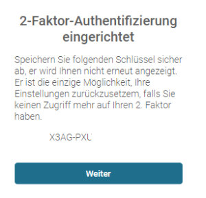 Nach erfolgter Verifizierung erscheint ein Recovery Code: Speichern Sie diesen Code an einem sicheren Ort (z.B. in einem Passwort-Manager). Sollten Sie aus Versehen den Eintrag in der App löschen, oder ein neues Smartphone verwenden, bei dem die Verbindung nicht übernommen wurde, können Sie mittels diesem Recovery-Code erneut einloggen. |